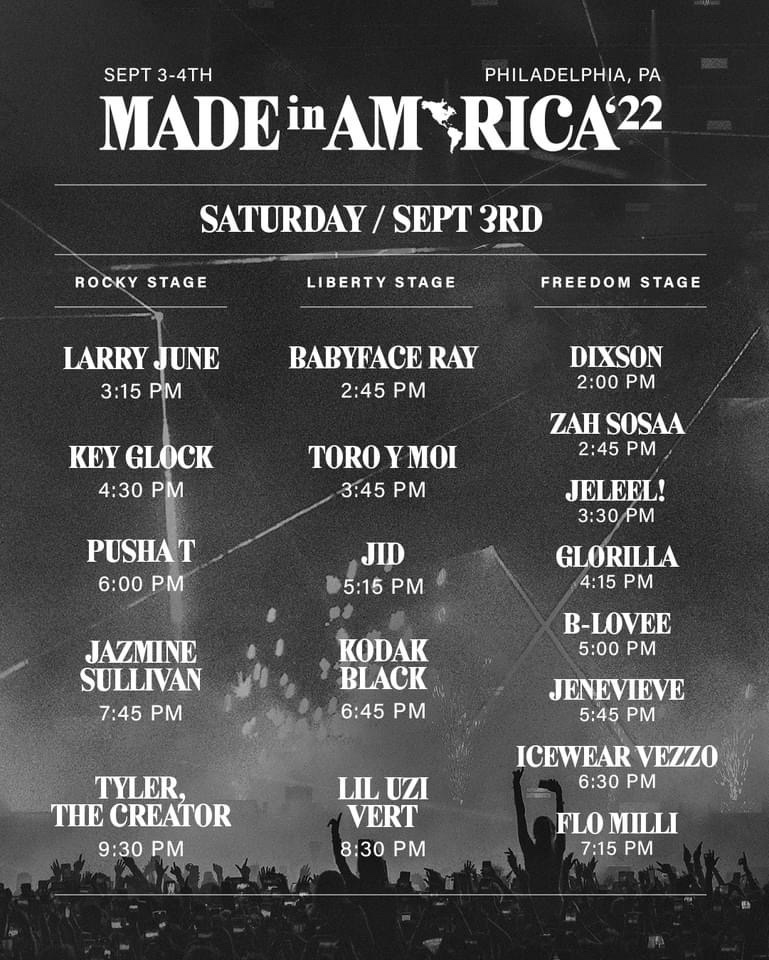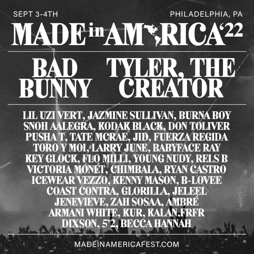 Made In America 2022 [Official Livestream] Tune in to #MIAFest LIVE from Philly 9/3 – 9/4! We’ll be streaming #MIAFest LIVE from Philly this Labor Day weekend with Bad Bunny, Tyler, The Creator, Lil Uzi Vert, Jazmine Sullivan, Burna Boy, Snoh Aalegra, Kodak Black, Pusha T, Tate McCrae, JID, Fuerza Regida, Toro y Moi and more!